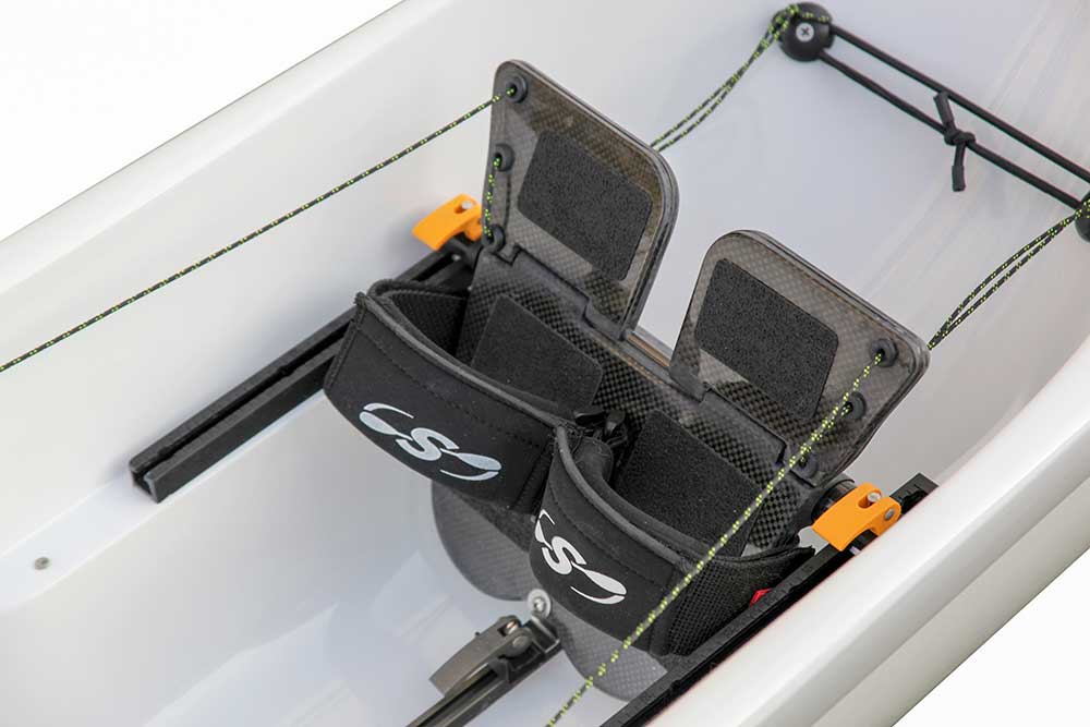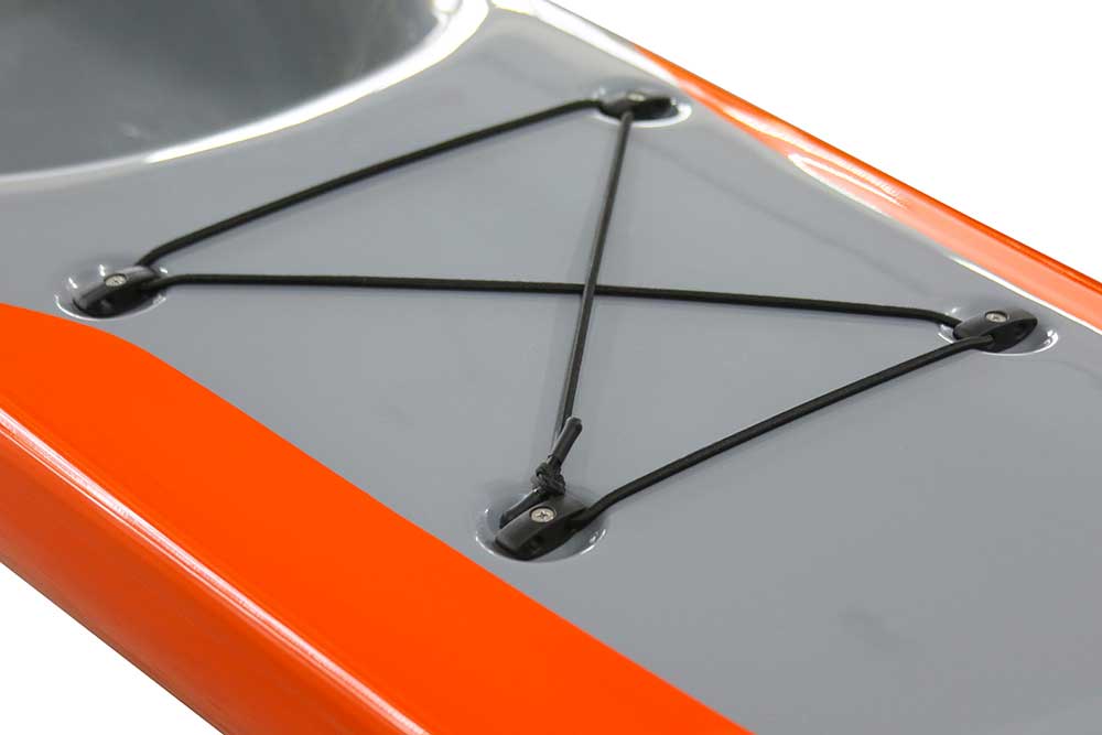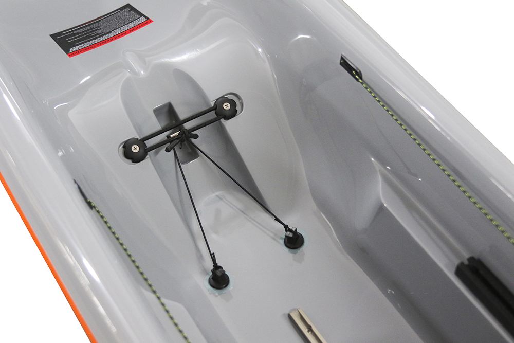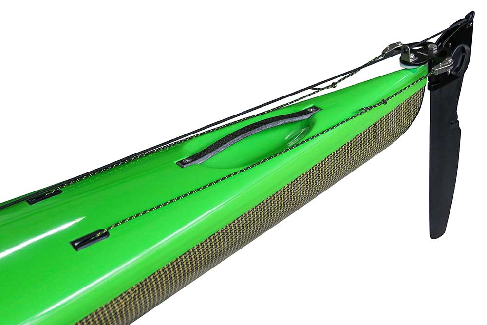Description: Single skin laminate hull made of Carbon & Kevlar® fabric, with clear gelcoat finish, and the deck is the standard Advantage construction. The hull is designed to be flexible and durable, but creates a stiff boat that can take some abuse in class I and II rapids and shallows, but is also at home in the ocean or the flats. The Surf Ski Multi-Sport construction comes standard with an over-stern rudder and fittings for an under-stern rudder, as well as a flush mounted Andersen Super mini-bailer.