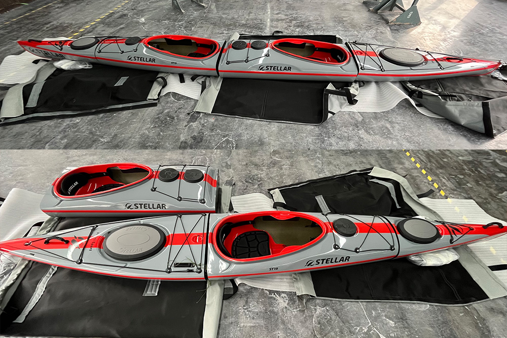 The ultimate lightweight family boat has arrived. Assembled as a single, it will perform like our iconic S14G2, with the advantage of being able to add an extra cockpit when needed turning it into a 19€™ double. Efficient and easy to paddle this boat is suitable for the beginner and advanced paddler alike. Complete with a skeg, hatches and bulkheads this fully functional kayak is a must for those who have space challenges. It is designed to accept a rudder if required. Ideal for both urban or camper van paddlers